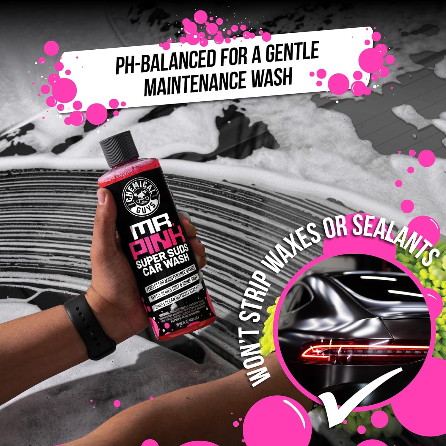 - Mr. Pink Car Wash Soap: Produces thick, foaming suds that gently lift dirt and grime for a scratch-free wash.